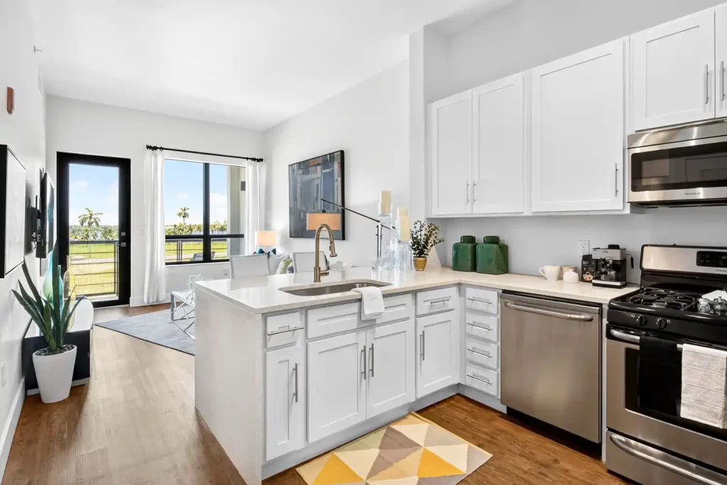 Enjoy a state-of-the-art kitchen equipped with stainless steel appliances, a gas range, and custom shaker cabinets – perfect for culinary enthusiasts. Our master bathrooms in two-bedroom units boast large soaking tubs and fully tiled shower stalls, providing a spa-like retreat. Every bedroom includes spacious walk-in closets, and our expansive terraces are ideal for relaxing, sunbathing, or dining al fresco.
